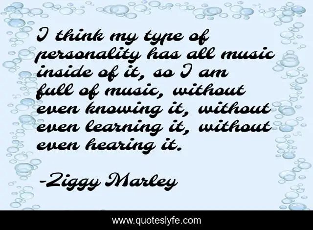 This page presents the quote "I think my type of personality has all music inside of it, so I am full of music, without even knowing it, without even learning it, without even hearing it.". Author of this quote is Ziggy Marley. This quote is about music, personality,.