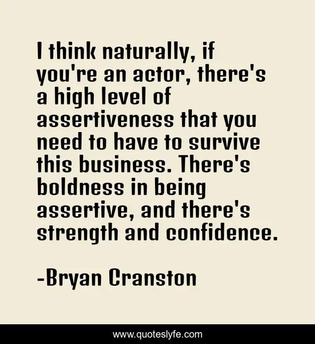 This page presents the quote "I think naturally, if you're an actor, there's a high level of assertiveness that you need to have to survive this business. There's boldness in being assertive, and there's strength and confidence.". Author of this quote is Bryan Cranston. This quote is about confidence, think, business,.