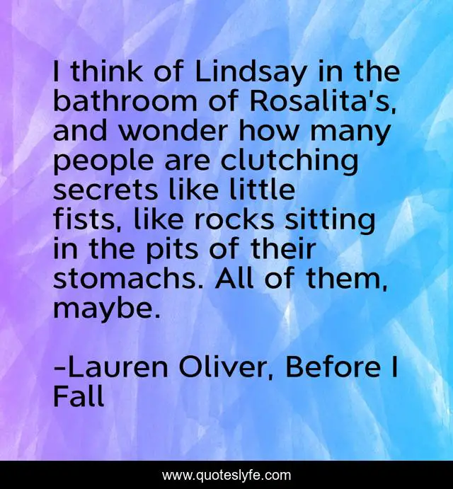 This page presents the quote "I think of Lindsay in the bathroom of Rosalita’s, and wonder how many people are clutching secrets like little fists, like rocks sitting in the pits of their stomachs. All of them, maybe.". Author of this quote is Lauren Oliver, Before I Fall. .