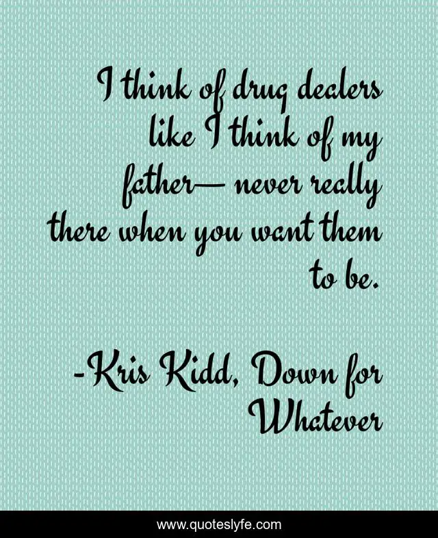 This page presents the quote "I think of drug dealers like I think of my father— never really there when you want them to be.". Author of this quote is Kris Kidd, Down for Whatever. This quote is about loss, addiction, loneliness, family,.