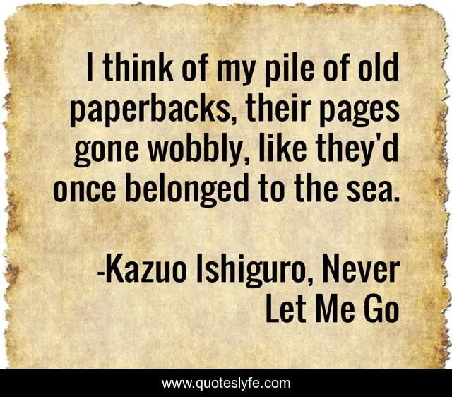 This page presents the quote "I think of my pile of old paperbacks, their pages gone wobbly, like they'd once belonged to the sea.". Author of this quote is Kazuo Ishiguro, Never Let Me Go. This quote is about books, reading,.