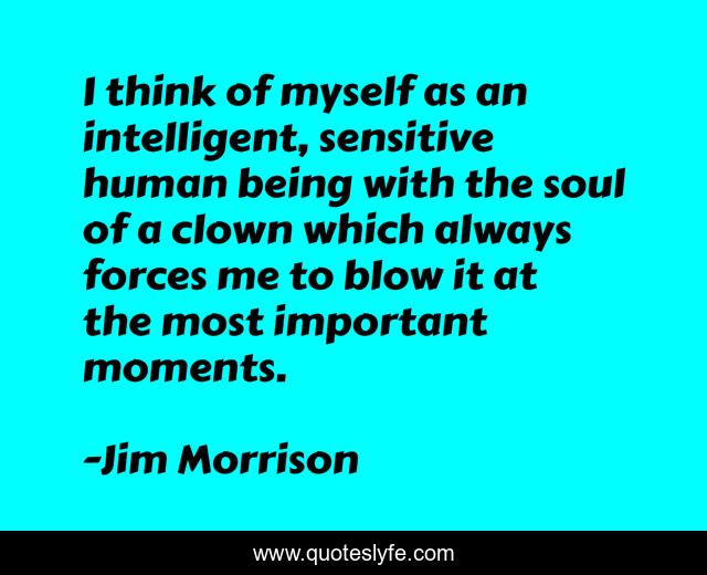 This page presents the quote "I think of myself as an intelligent, sensitive human being with the soul of a clown which always forces me to blow it at the most important moments.". Author of this quote is Jim Morrison. This quote is about timing, intelligence, emotions,.