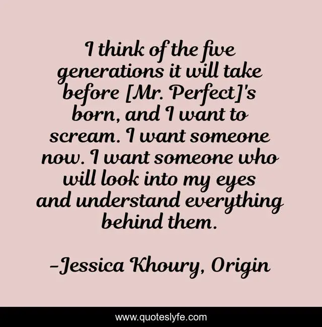 This page presents the quote "I think of the five generations it will take before [Mr. Perfect]'s born, and I want to scream. I want someone now. I want someone who will look into my eyes and understand everything behind them.". Author of this quote is Jessica Khoury, Origin. This quote is about origin, love, immortals, immortality, soul-mate, affection,.