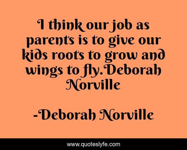 This page presents the quote "I think our job as parents is to give our kids roots to grow and wings to fly.Deborah Norville". Author of this quote is Deborah Norville. This quote is about grow, wings, roots, children,.