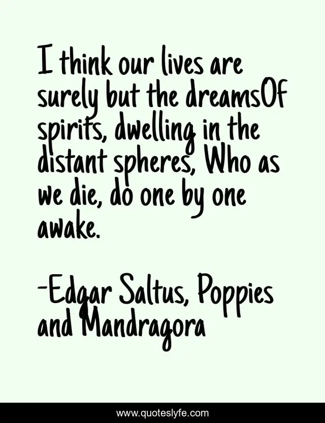 This page presents the quote "I think our lives are surely but the dreamsOf spirits, dwelling in the distant spheres, Who as we die, do one by one awake.". Author of this quote is Edgar Saltus, Poppies and Mandragora. This quote is about living, spirits, sphere, life-is-a-dream, spheres, lives,.
