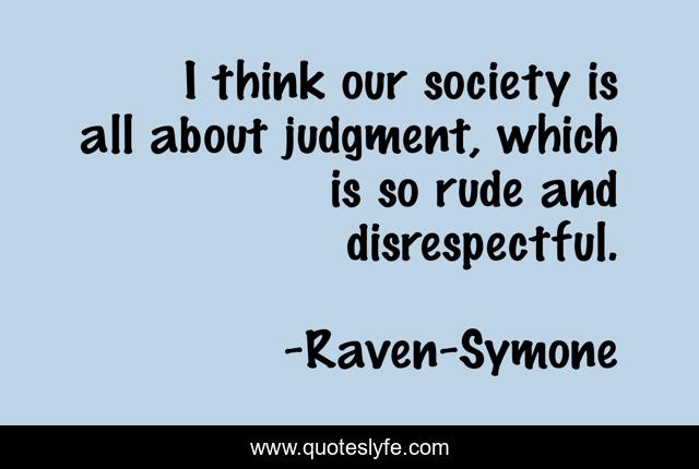 This page presents the quote "I think our society is all about judgment, which is so rude and disrespectful.". Author of this quote is Raven-Symone. This quote is about judgment, think, rude,.