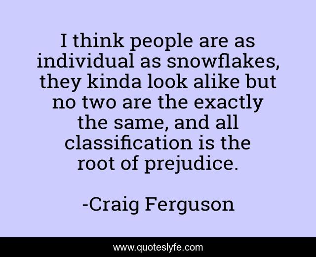 This page presents the quote "I think people are as individual as snowflakes, they kinda look alike but no two are the exactly the same, and all classification is the root of prejudice.". Author of this quote is Craig Ferguson. This quote is about people-skills, late-late-show, uniqueness, prejudice, unique, snowflakes,.