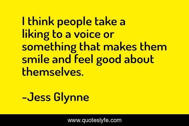 This page presents the quote "I think people take a liking to a voice or something that makes them smile and feel good about themselves.". Author of this quote is Jess Glynne. This quote is about feel good, good, people,.