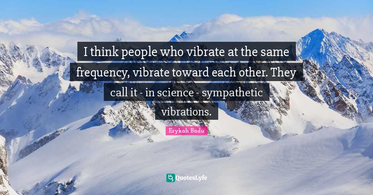 This page presents the quote "I think people who vibrate at the same frequency, vibrate toward each other. They call it - in science - sympathetic vibrations.". Author of this quote is Erykah Badu. This quote is about sympathetic, frequency, vibrate, vibrations, people, science, thinking,.