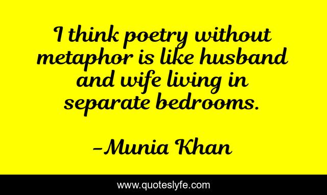 This page presents the quote "I think poetry without metaphor is like husband and wife living in separate bedrooms.". Author of this quote is Munia Khan. This quote is about living, metaphor, metaphors-similies, metaphorical, husband, bedrooms, poetry, wisdom, poetry-life,.