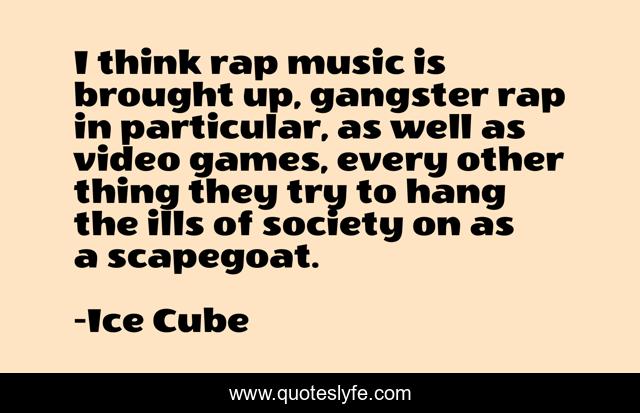 This page presents the quote "I think rap music is brought up, gangster rap in particular, as well as video games, every other thing they try to hang the ills of society on as a scapegoat.". Author of this quote is Ice Cube. This quote is about video games, music, think,.