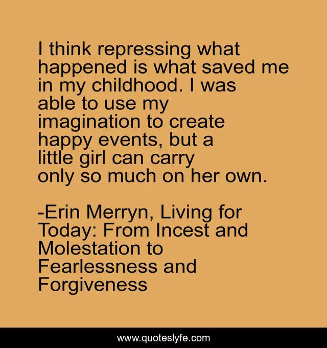 This page presents the quote "I think repressing what happened is what saved me in my childhood. I was able to use my imagination to create happy events, but a little girl can carry only so much on her own.". Author of this quote is Erin Merryn, Living for Today: From Incest and Molestation to Fearlessness and Forgiveness. This quote is about child-abuse, molestation, survivor, trigger-warning, survival, repressed-memories, imagination, trigger, childhood,.