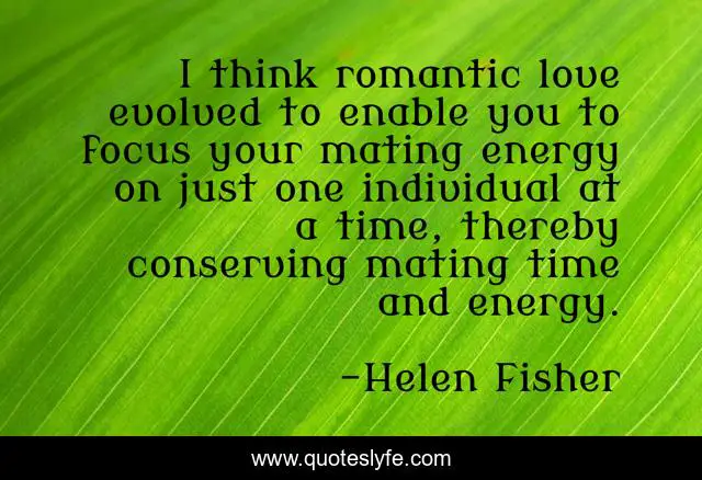 This page presents the quote "I think romantic love evolved to enable you to focus your mating energy on just one individual at a time, thereby conserving mating time and energy.". Author of this quote is Helen Fisher. This quote is about love, focus, affection, time,.