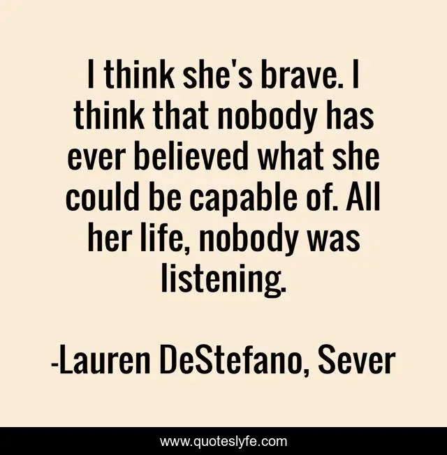 This page presents the quote "I think she's brave. I think that nobody has ever believed what she could be capable of. All her life, nobody was listening.". Author of this quote is Lauren DeStefano, Sever. This quote is about strong, bravery, listening,.