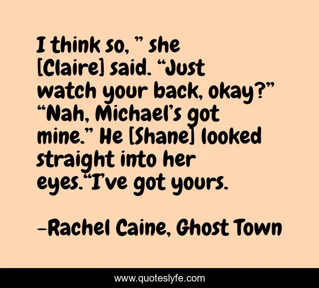 This page presents the quote "I think so, ” she [Claire] said. “Just watch your back, okay?” “Nah, Michael’s got mine.” He [Shane] looked straight into her eyes.“I’ve got yours.". Author of this quote is Rachel Caine, Ghost Town. This quote is about funny, eve-rosser, humor, vampires, shane-collins, morganville-vampires, myrnin, vampire, ghost-town,.