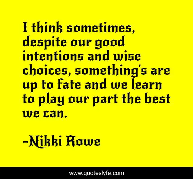 This page presents the quote "I think sometimes, despite our good intentions and wise choices, something's are up to fate and we learn to play our part the best we can.". Author of this quote is Nikki Rowe. This quote is about beautiful, life, trust, nikki-rowe, destiny, fate, quote-of-the-day, insight, chaos,.