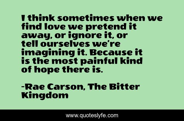 This page presents the quote "I think sometimes when we find love we pretend it away, or ignore it, or tell ourselves we’re imagining it. Because it is the most painful kind of hope there is.". Author of this quote is Rae Carson, The Bitter Kingdom. This quote is about love, pretend, ignore, imagination, hope, pain, affection,.