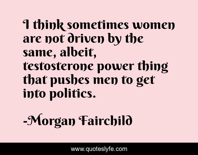 This page presents the quote "I think sometimes women are not driven by the same, albeit, testosterone power thing that pushes men to get into politics.". Author of this quote is Morgan Fairchild. This quote is about men, power, women,.