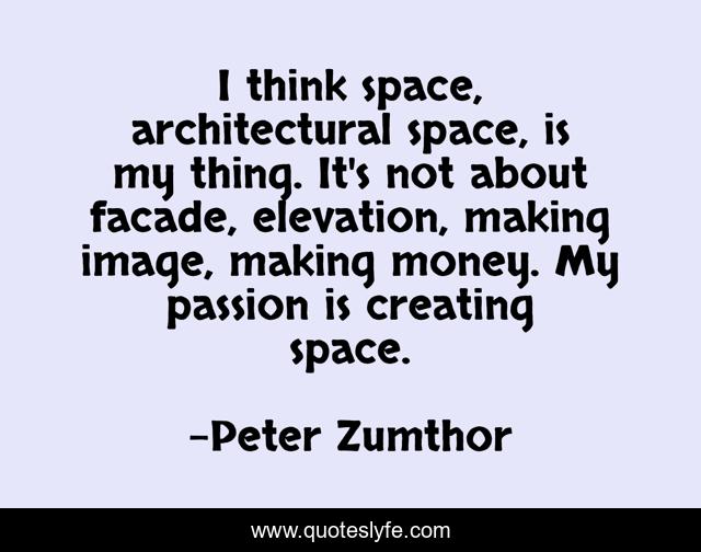 This page presents the quote "I think space, architectural space, is my thing. It's not about facade, elevation, making image, making money. My passion is creating space.". Author of this quote is Peter Zumthor. This quote is about money, making money, passion,.