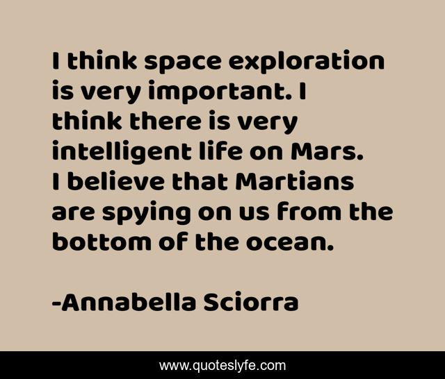 This page presents the quote "I think space exploration is very important. I think there is very intelligent life on Mars. I believe that Martians are spying on us from the bottom of the ocean.". Author of this quote is Annabella Sciorra. This quote is about life, believe, ocean,.