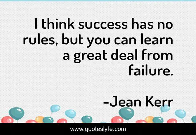 This page presents the quote "I think success has no rules, but you can learn a great deal from failure.". Author of this quote is Jean Kerr. This quote is about rules, great, success,.