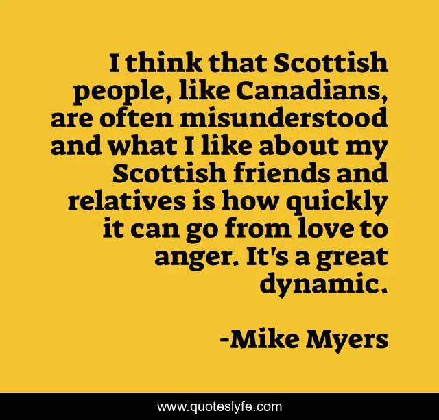 This page presents the quote "I think that Scottish people, like Canadians, are often misunderstood and what I like about my Scottish friends and relatives is how quickly it can go from love to anger. It's a great dynamic.". Author of this quote is Mike Myers. This quote is about love, great, friends, affection,.