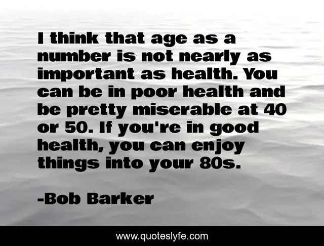 This page presents the quote "I think that age as a number is not nearly as important as health. You can be in poor health and be pretty miserable at 40 or 50. If you're in good health, you can enjoy things into your 80s.". Author of this quote is Bob Barker. This quote is about good health, good, health,.