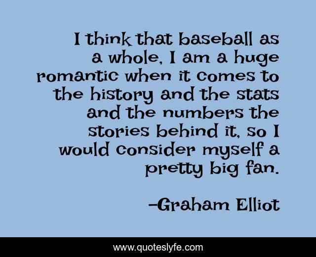 This page presents the quote "I think that baseball as a whole, I am a huge romantic when it comes to the history and the stats and the numbers the stories behind it, so I would consider myself a pretty big fan.". Author of this quote is Graham Elliot. This quote is about myself, baseball, history,.