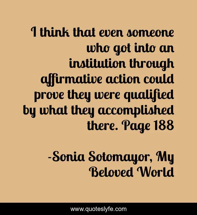 This page presents the quote "I think that even someone who got into an institution through affirmative action could prove they were qualified by what they accomplished there. Page 188". Author of this quote is Sonia Sotomayor, My Beloved World. This quote is about affirmative-action, school, education,.