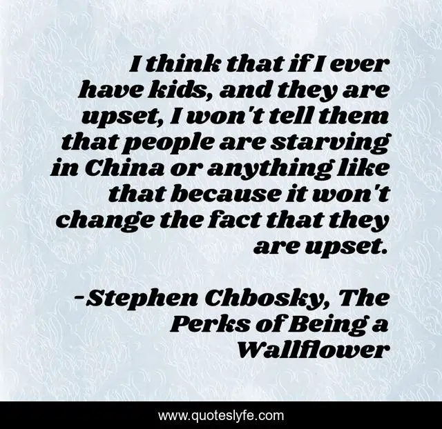 This page presents the quote "I think that if I ever have kids, and they are upset, I won't tell them that people are starving in China or anything like that because it won't change the fact that they are upset.". Author of this quote is Stephen Chbosky, The Perks of Being a Wallflower. .