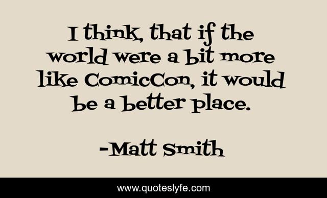 This page presents the quote "I think, that if the world were a bit more like ComicCon, it would be a better place.". Author of this quote is Matt Smith. This quote is about life, words-of-wisdom, geeks, truth, doctor-who, comiccon, nerds, happiness,.