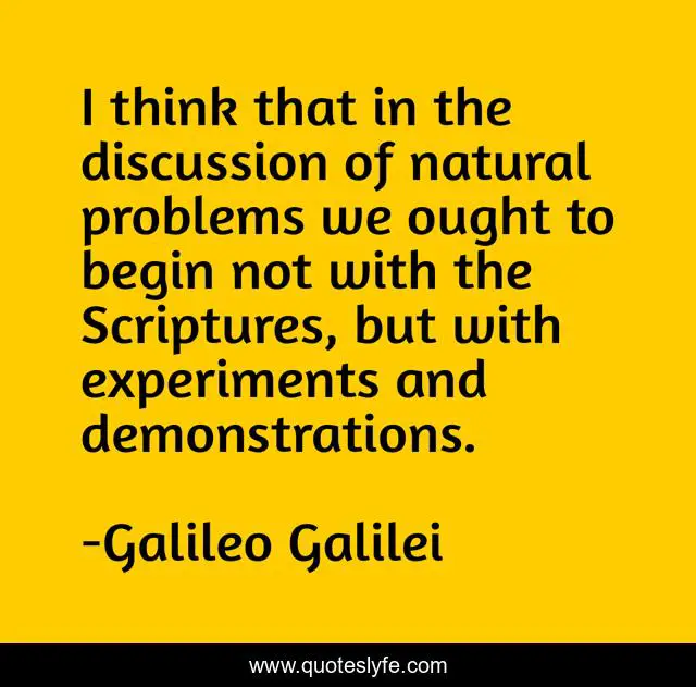 This page presents the quote "I think that in the discussion of natural problems we ought to begin not with the Scriptures, but with experiments and demonstrations.". Author of this quote is Galileo Galilei. This quote is about observable, natural, nature, science, demonstration, ignorance, superstition, experiment, testable,.