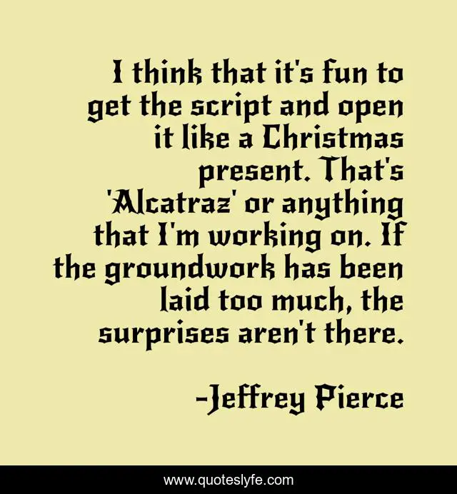 This page presents the quote "I think that it's fun to get the script and open it like a Christmas present. That's 'Alcatraz' or anything that I'm working on. If the groundwork has been laid too much, the surprises aren't there.". Author of this quote is Jeffrey Pierce. This quote is about fun, think, working,.