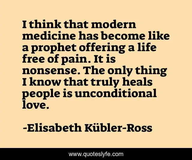 This page presents the quote "I think that modern medicine has become like a prophet offering a life free of pain. It is nonsense. The only thing I know that truly heals people is unconditional love.". Author of this quote is Elisabeth Kübler-Ross. This quote is about pain, people, prophet, modern, nonsense, free, unconditional-love, medicine, heals,.