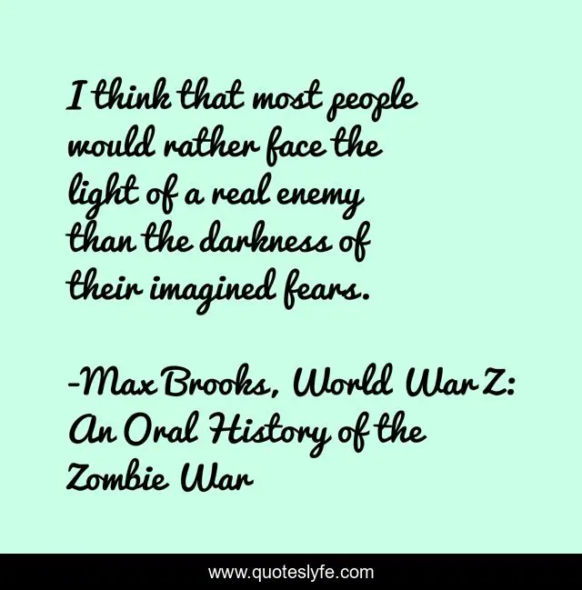 This page presents the quote "I think that most people would rather face the light of a real enemy than the darkness of their imagined fears.". Author of this quote is Max Brooks, World War Z: An Oral History of the Zombie War. This quote is about enemy, fear,.