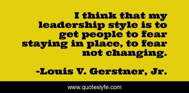 This page presents the quote "I think that my leadership style is to get people to fear staying in place, to fear not changing.". Author of this quote is Louis V. Gerstner, Jr.. This quote is about style, leadership, people,.