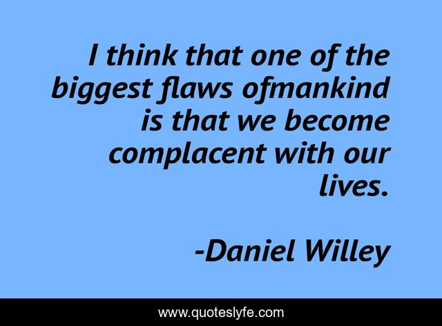 This page presents the quote "I think that one of the biggest flaws ofmankind is that we become complacent with our lives.". Author of this quote is Daniel Willey. This quote is about complacent, flaw, flaws, complacency, humans, life, live, lives, mankind,.