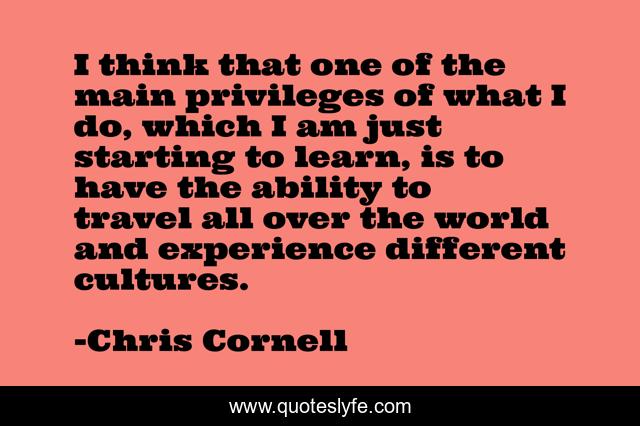 This page presents the quote "I think that one of the main privileges of what I do, which I am just starting to learn, is to have the ability to travel all over the world and experience different cultures.". Author of this quote is Chris Cornell. This quote is about world, experience,.