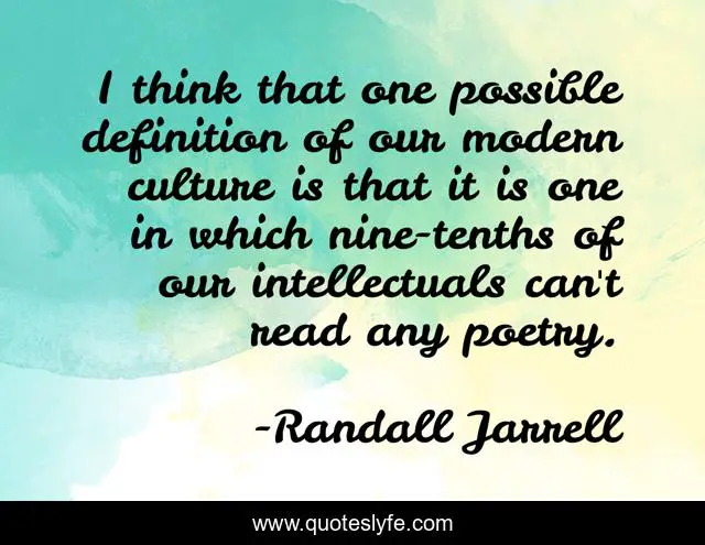 This page presents the quote "I think that one possible definition of our modern culture is that it is one in which nine-tenths of our intellectuals can't read any poetry.". Author of this quote is Randall Jarrell. This quote is about culture, modern, think,.