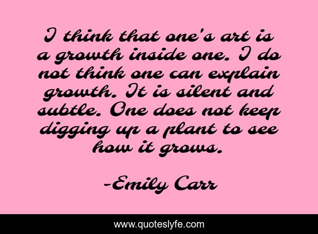 This page presents the quote "I think that one's art is a growth inside one. I do not think one can explain growth. It is silent and subtle. One does not keep digging up a plant to see how it grows.". Author of this quote is Emily Carr. This quote is about growth, art,.
