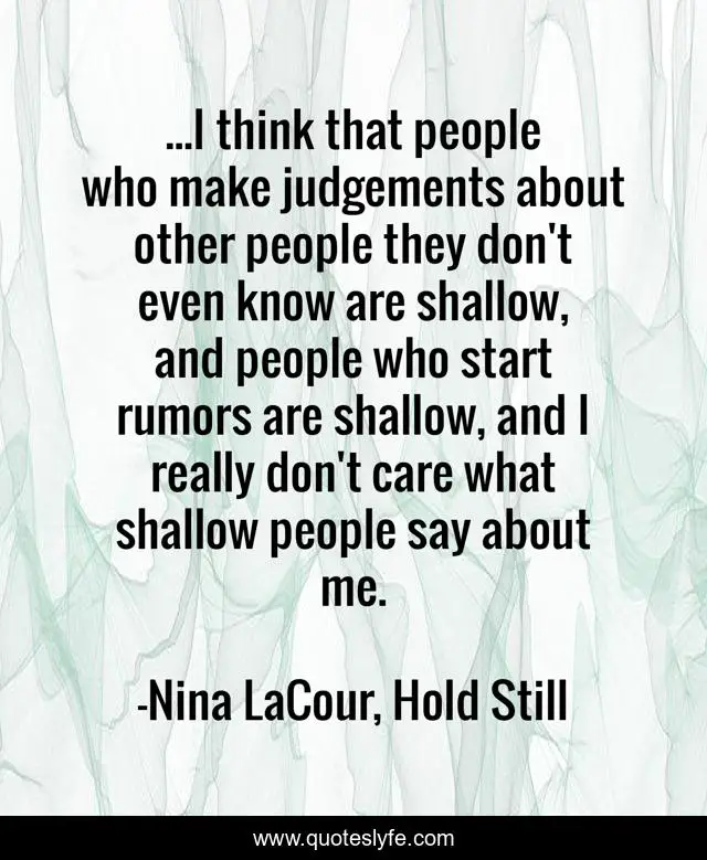 This page presents the quote "...I think that people who make judgements about other people they don't even know are shallow, and people who start rumors are shallow, and I really don't care what shallow people say about me.". Author of this quote is Nina LaCour, Hold Still. This quote is about shallow, rumors, care,.