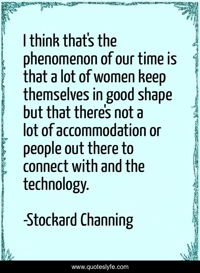 This page presents the quote "I think that's the phenomenon of our time is that a lot of women keep themselves in good shape but that there's not a lot of accommodation or people out there to connect with and the technology.". Author of this quote is Stockard Channing. This quote is about good, time, women,.