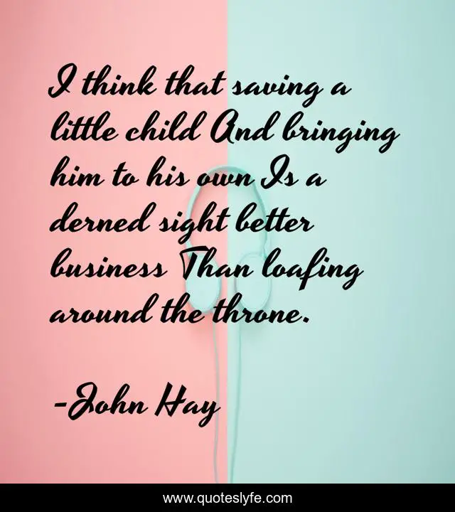 This page presents the quote "I think that saving a little child And bringing him to his own Is a derned sight better business Than loafing around the throne.". Author of this quote is John Hay. .