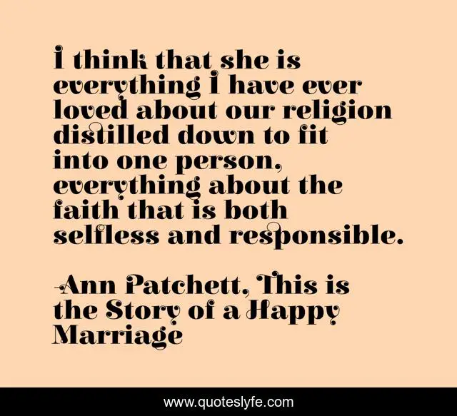 This page presents the quote "I think that she is everything I have ever loved about our religion distilled down to fit into one person, everything about the faith that is both selfless and responsible.". Author of this quote is Ann Patchett, This is the Story of a Happy Marriage. This quote is about faith, love, selflessness, religion, responsibility, affection,.
