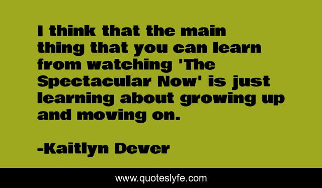 This page presents the quote "I think that the main thing that you can learn from watching 'The Spectacular Now' is just learning about growing up and moving on.". Author of this quote is Kaitlyn Dever. This quote is about growing up, moving, learning,.