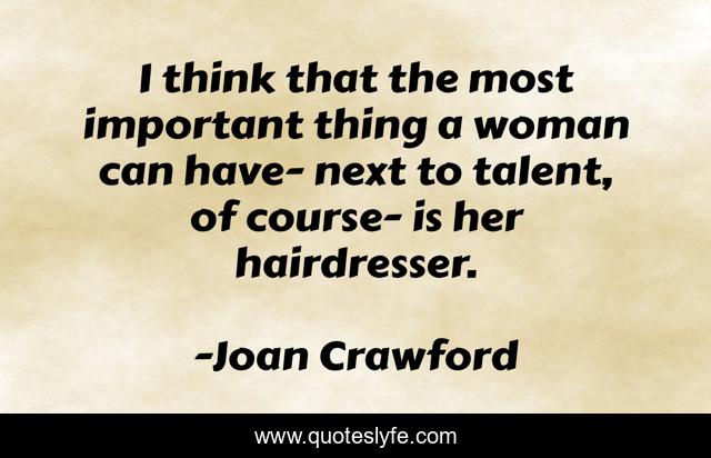 This page presents the quote "I think that the most important thing a woman can have- next to talent, of course- is her hairdresser.". Author of this quote is Joan Crawford. This quote is about hair, hairdresser, talent, stylist, women,.