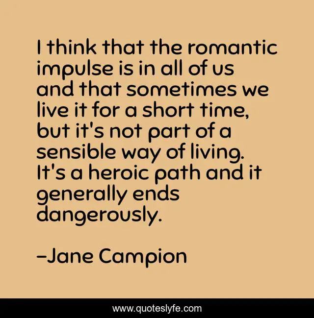 This page presents the quote "I think that the romantic impulse is in all of us and that sometimes we live it for a short time, but it's not part of a sensible way of living. It's a heroic path and it generally ends dangerously.". Author of this quote is Jane Campion. This quote is about path, short, time,.