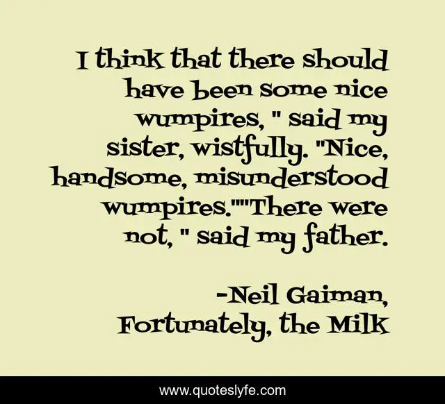 This page presents the quote "I think that there should have been some nice wumpires, " said my sister, wistfully. "Nice, handsome, misunderstood wumpires.""There were not, " said my father.". Author of this quote is Neil Gaiman, Fortunately, the Milk. This quote is about humor, twilight, vampires,.