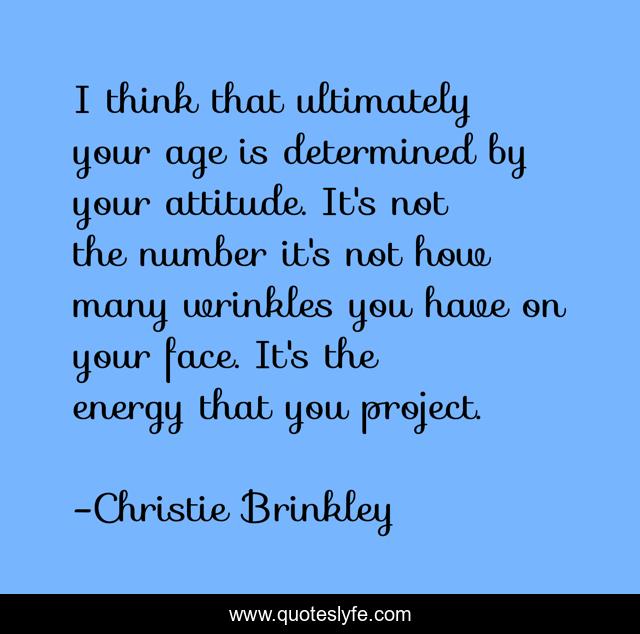 This page presents the quote "I think that ultimately your age is determined by your attitude. It's not the number it's not how many wrinkles you have on your face. It's the energy that you project.". Author of this quote is Christie Brinkley. This quote is about age, energy, think,.
