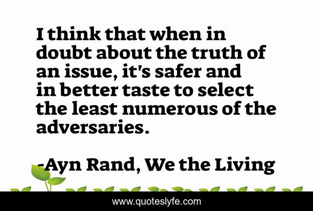 This page presents the quote "I think that when in doubt about the truth of an issue, it's safer and in better taste to select the least numerous of the adversaries.". Author of this quote is Ayn Rand, We the Living. This quote is about challenge, minority-opinion, subversion, doubt, truth, oppression,.